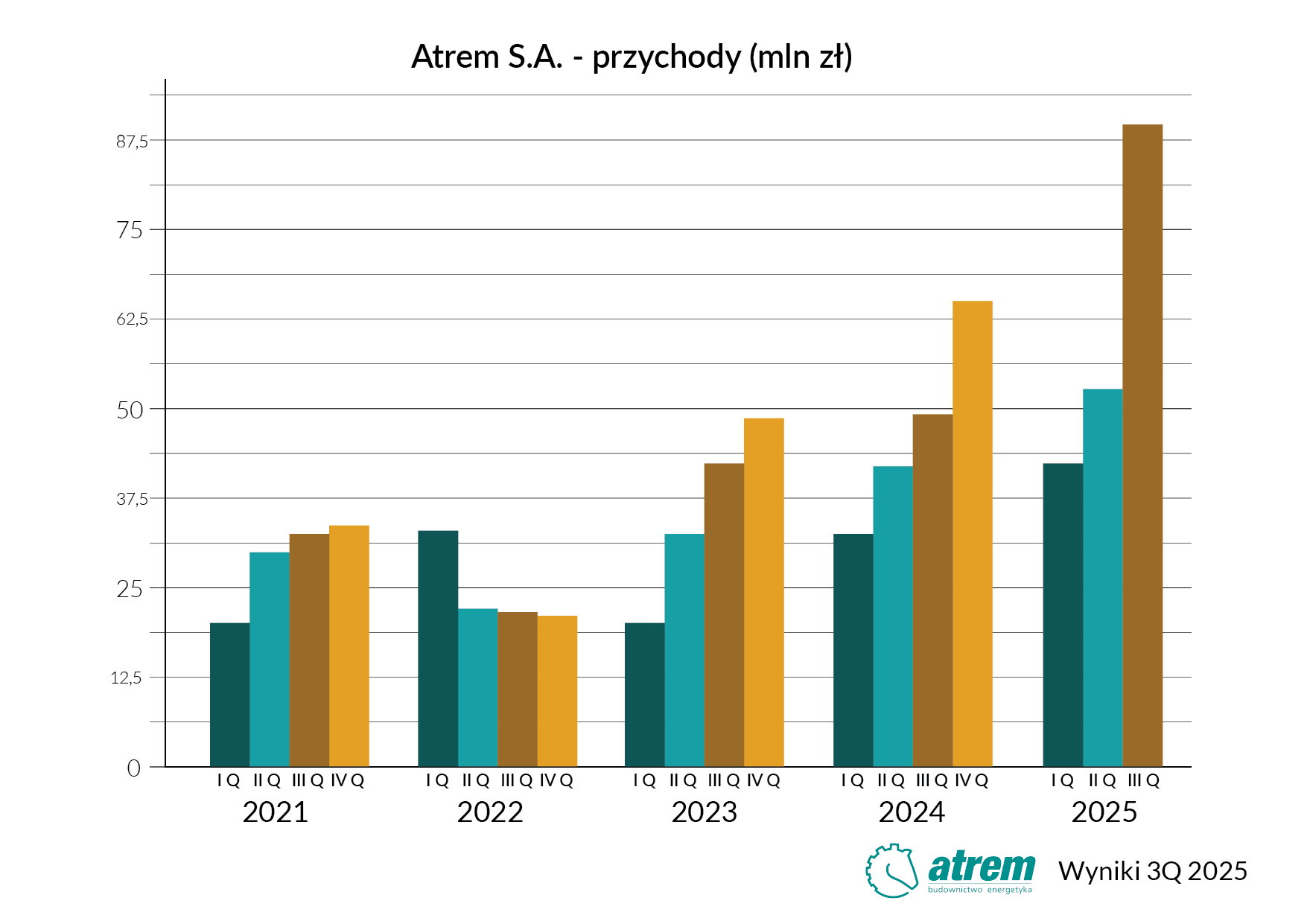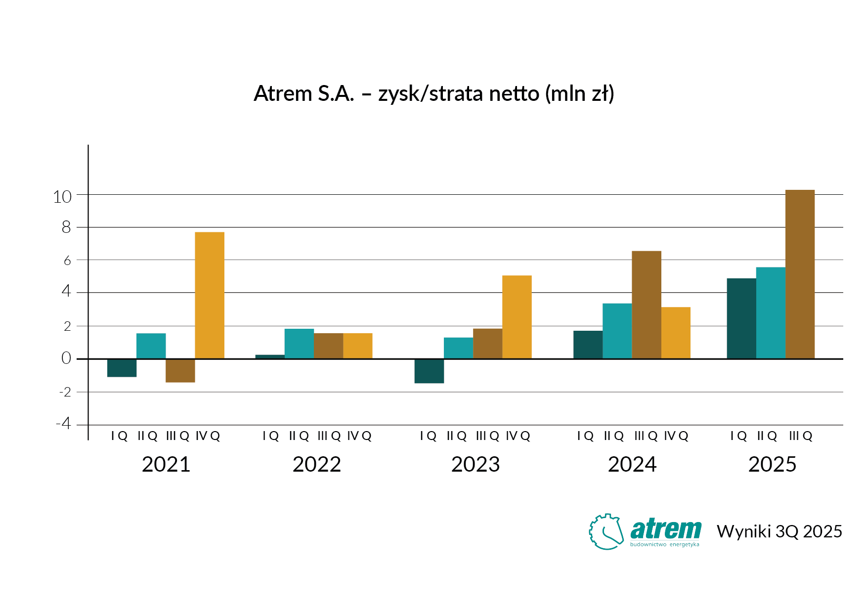 W celu dewelopingu projektów biometanowych spółka w roku ubiegłym utworzyła dwie spółki zależne. Na moment publikacji wyników za III kwartały 2025 roku podmioty te nie rozpoczęły działalności operacyjnej i zostały objęte zwolnieniem z konsolidacji ze względu na istotność danych. W związku z tym skonsolidowane dane finansowe Grupy Kapitałowej Atrem są tożsame z jednostkowymi danymi spółki Atrem S.A.