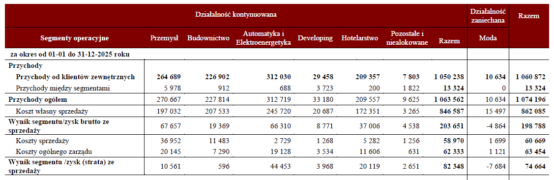 Wcześniej opublikowano wyniki notowanych na GPW spółek zależnych GKI: PJP Makrum i Atremu. Przychody segmentu przemysłowego osiągnęły wartość 264,7 mln zł i były niższe o 5%, niż rok wcześniej. Wynik segmentu, na który składają się systemy przeładunkowe, maszyny MAKRUM, systemy parkingowe, wyposażenie magazynów, ślusarka otworowa aluminiowa i PCV to 10,6 mln zł. W budownictwie, które też działa w ramach Grupy Przemysłowej PJP Makrum, sprzedaż wyniosła 226,9 mln zł, co stanowiło wzrost o 38%. Wynik to 0,6 mln zł, a portfel zamówień na dzień publikacji sprawozdania 261 mln zł.W segmencie automatyki i elektroenergetyki (Atrem S.A.) przychody wyniosły 312,0 mln zł, co oznacza wzrost o 67%. Wynik to 44,5 mln zł. W developingu, w którym w zeszłym roku nie było nowych oddań do użytku, przychód ze sprzedaży to 29,5 mln zł, a wynik segmentu 4 mln zł. W 2026 zostaną oddane do użytku nowe etapu dwóch inwestycji: Platanowy Park i Osiedle Uniwersyteckie. W hotelarstwie (Focus Hotels S.A.) przychody netto ze sprzedaży w segmencie wyniosły 209,4 mln zł (wzrost o 12,5%). Do wyniku kontrybuowały obiekty otwarte w 2025 roku: w Krakowie i Wrocławiu. Uwagę zwraca solidny wzrost średniej ceny sprzedanego pokoju (+7,7%) a co za tym idzie również wskaźnik RevPar tj. przychód na dostępny pokój (+8,4%). Już w 2026 roku spółka otworzyła Focus Hotel Premium Olsztyn. Plany sieci zakładają rozwój sieci własnej oraz współpracę z międzynarodowymi sieciami zarówno w Polsce, jak i za granicą - w krajach Europy Środkowo-Wschodniej. Focus Hotels stał się certyfikowanym operatorem dla największych europejskich marek. Na stronie ir.immobile.com.pl dostępne są m.in. Skonsolidowane Sprawozdanie Zarządu, Skonsolidowane Sprawozdaniem Finansowe oraz List Prezesa Zarządu.