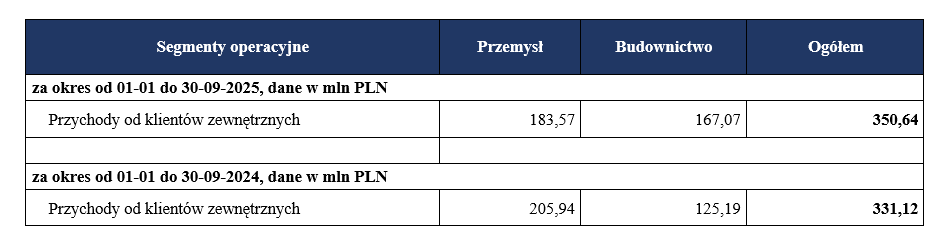 Szacowane przychody od klientów zewnętrznych w okresie od 1 stycznia do 30 września br. 350,64 mln zł przy 331,12 mln zł w tym samym okresie w roku 2024. Wzrost wyniósł 5,9%. W segmencie budownictwa portfel zamówień na 30 września wyniósł 117,91 mln zł.